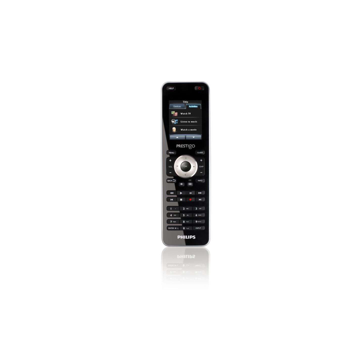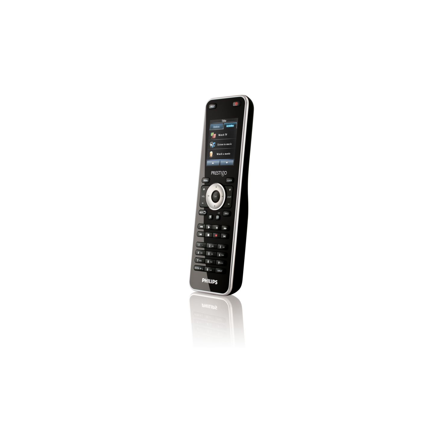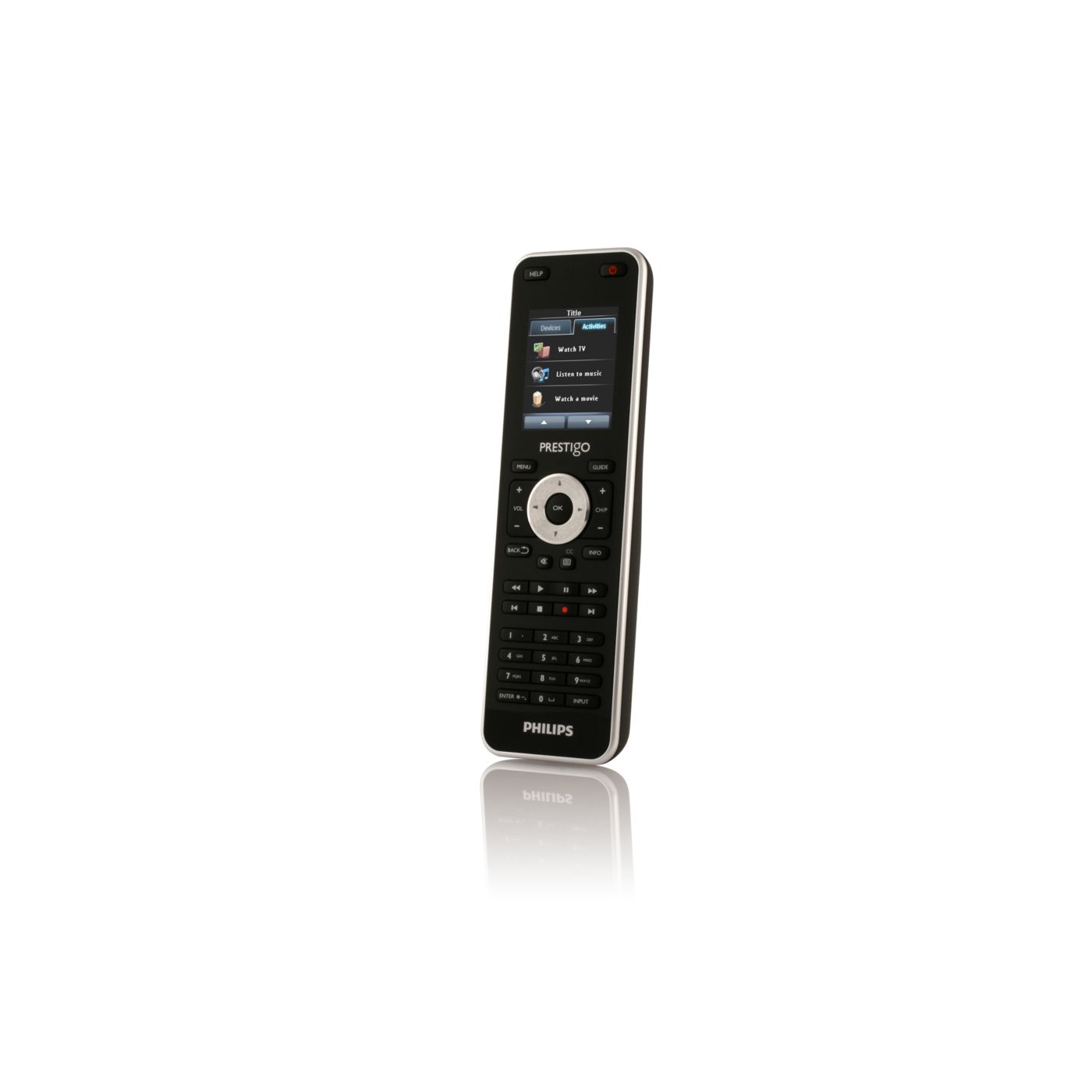 Start your home entertainment activities with one touch of a button instead of controlling each individual device in separate steps. Simply press the activity button like 'Watch a movie' and the Prestigo will automatically switch on the different devices, such as the TV, DVD player and Home theatre system, to watch a movie.
